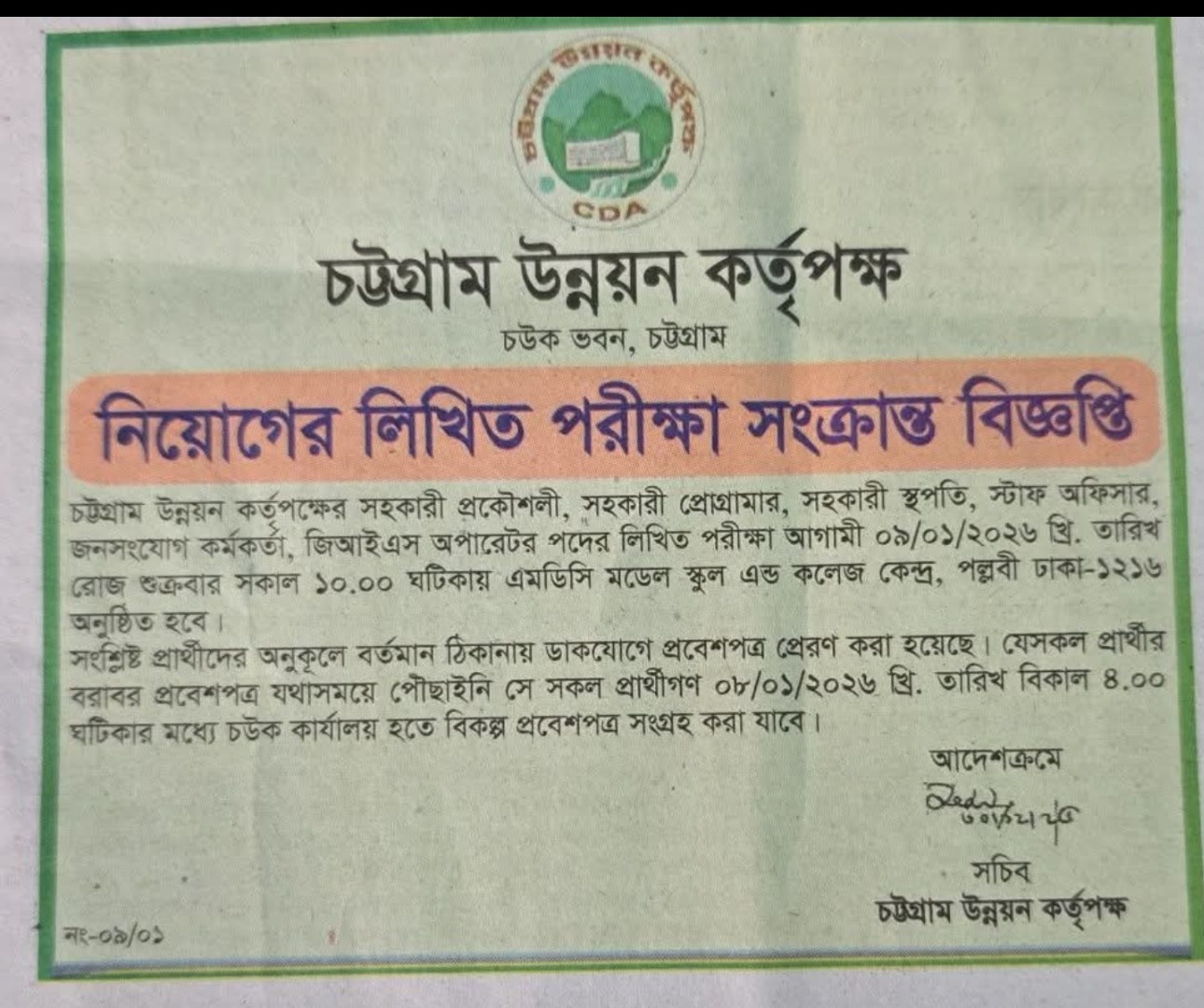 চট্টগ্রাম উন্নয়ন কর্তৃপক্ষের ২৪/০১/২০২৬ খ্রিঃ তারিখ অনুষ্ঠিত জনবল নিয়োগের লিখিত পরীক্ষার ফলাফল এবং ২৭/০১/২০২৬ ও ২৮/০১/২০২৬ খ্রিঃ তারিখ অনুষ্ঠিত মৌখিক পরীক্ষার ফলাফলের ভিত্তিতে চূড়ান্তভাবে নির্বাচিত প্রার্থীগনের তালিকা |